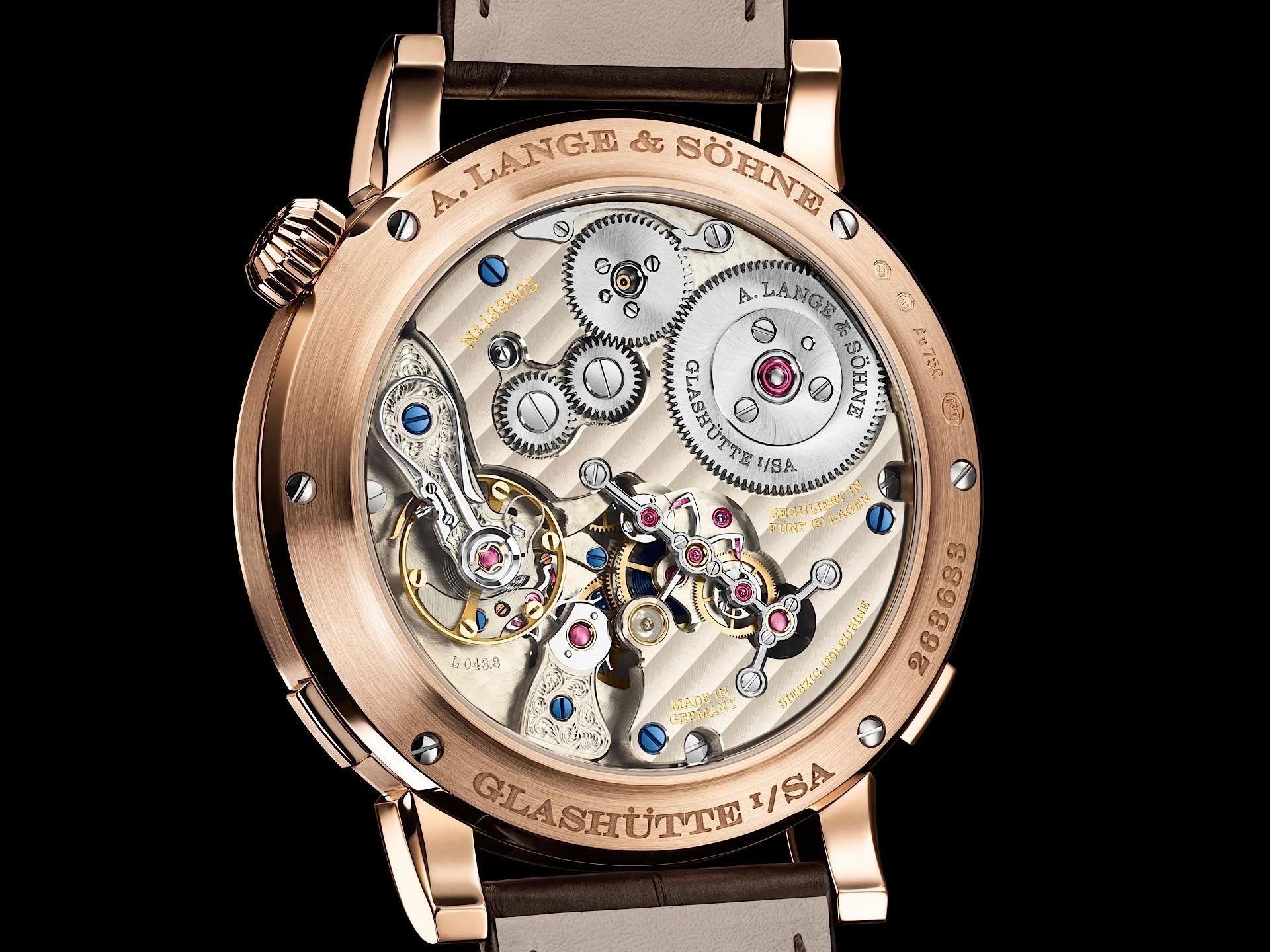 Wie immer bei Lange finden sich aufwendige Handverzierungen auf dem Werk: ein handgravierter Unruhkloben mit Schwanenhalsfeder, Glashütter Streifen, doppelter Sonnenschliff auf dem Sperrrad, und die T-förmige Brücke für das Nachspannwerk trägt anglierte, also abgeschrägte und polierte Kanten sowie polierte Senkungen für die Schrauben. Sogar verschraubte Goldchatons für zwei Lagersteine fanden hier Platz.