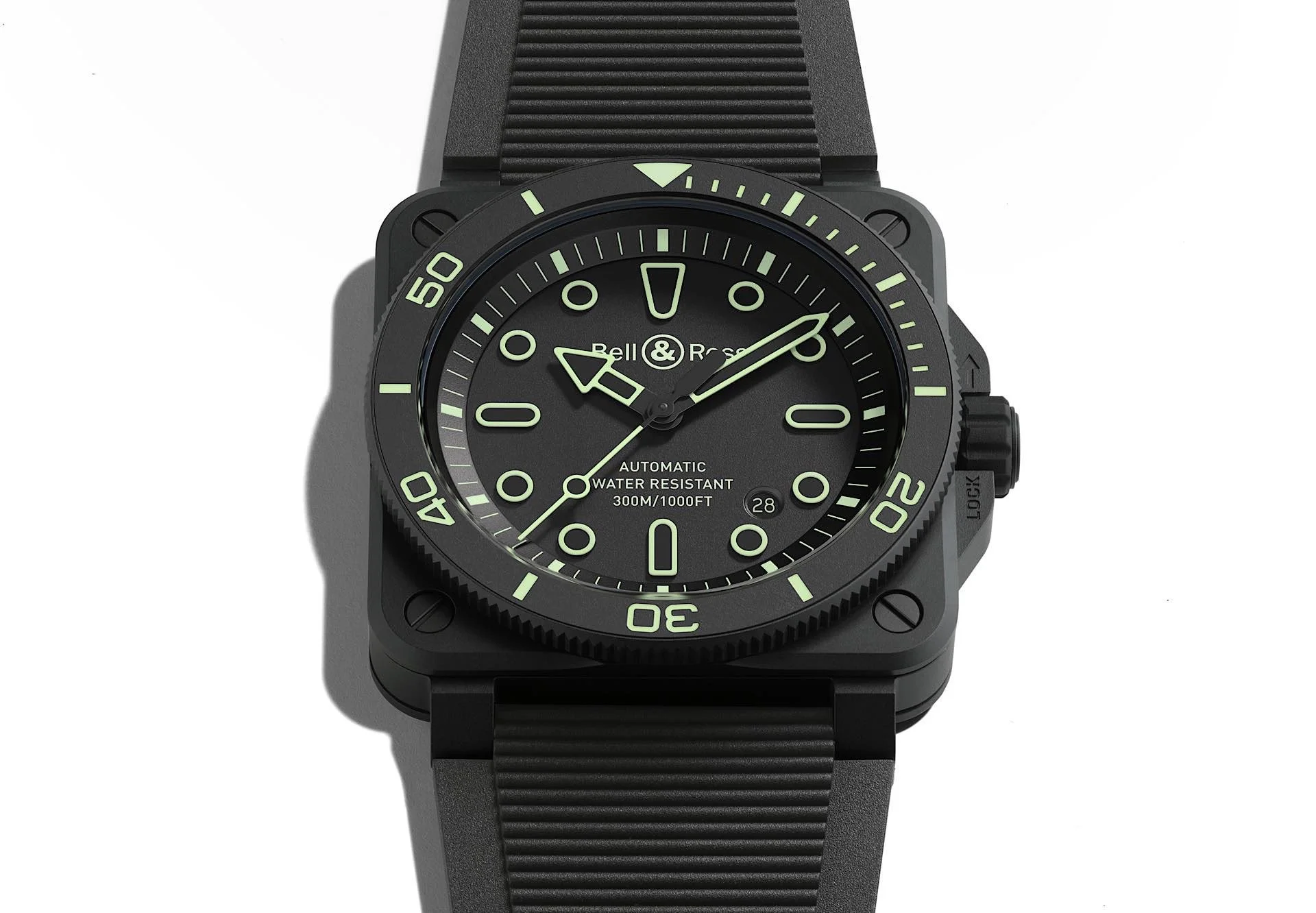 Die neue limitierte Taucheruhr von Bell & Ross ist eine Toolwatch mit ungewöhnlichem Twist: Während das kratzfeste, schwarze Keramikgehäuse mit 300 Metern Wasserdichtigkeit maximale Funktionalität garantiert, leuchten die Konturen von Zeigern und Indizes im Dunkeln wie Neonreklame.