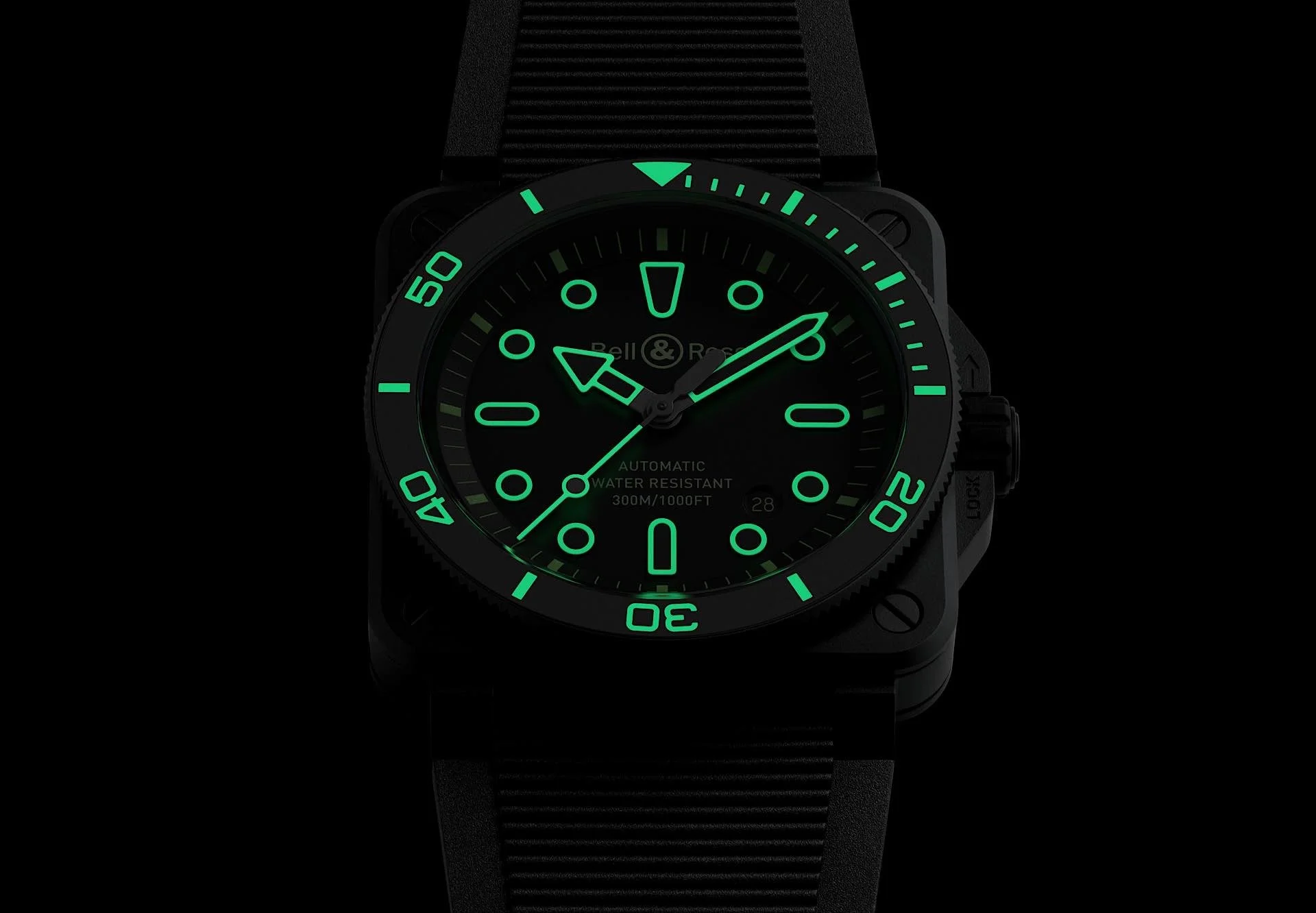 Mit der BR-03 Diver Lum Outline kommt nun die nächste Toolwatch mit einem Twist. Das schwarze, 42 Millimeter große Gehäuse besteht aus kratzfester, matter Keramik, besitzt eine verschraubte Aufzugskrone mit Kronenschutz und ist bis 300 Meter Tiefe druckfest. Die einseitig drehbare Lünette erlaubt sogar Tauchgänge mit der Uhr. Diese Funktionalität wird von der Nachtgrafik spielerisch gebrochen: Bei Indexen und Zeigern leuchten die Konturen wie bei Neonleuchtreklame. Dazu passt, dass die Super-LumiNova X2 in einem intensiven Grün leuchtet. Dabei beeinträchtigt das einzigartige Design nicht die Ablesbarkeit.