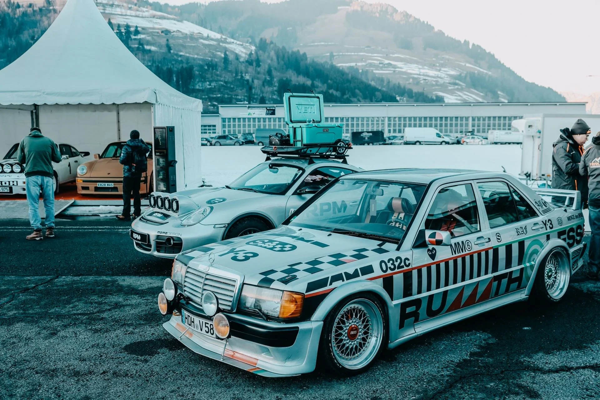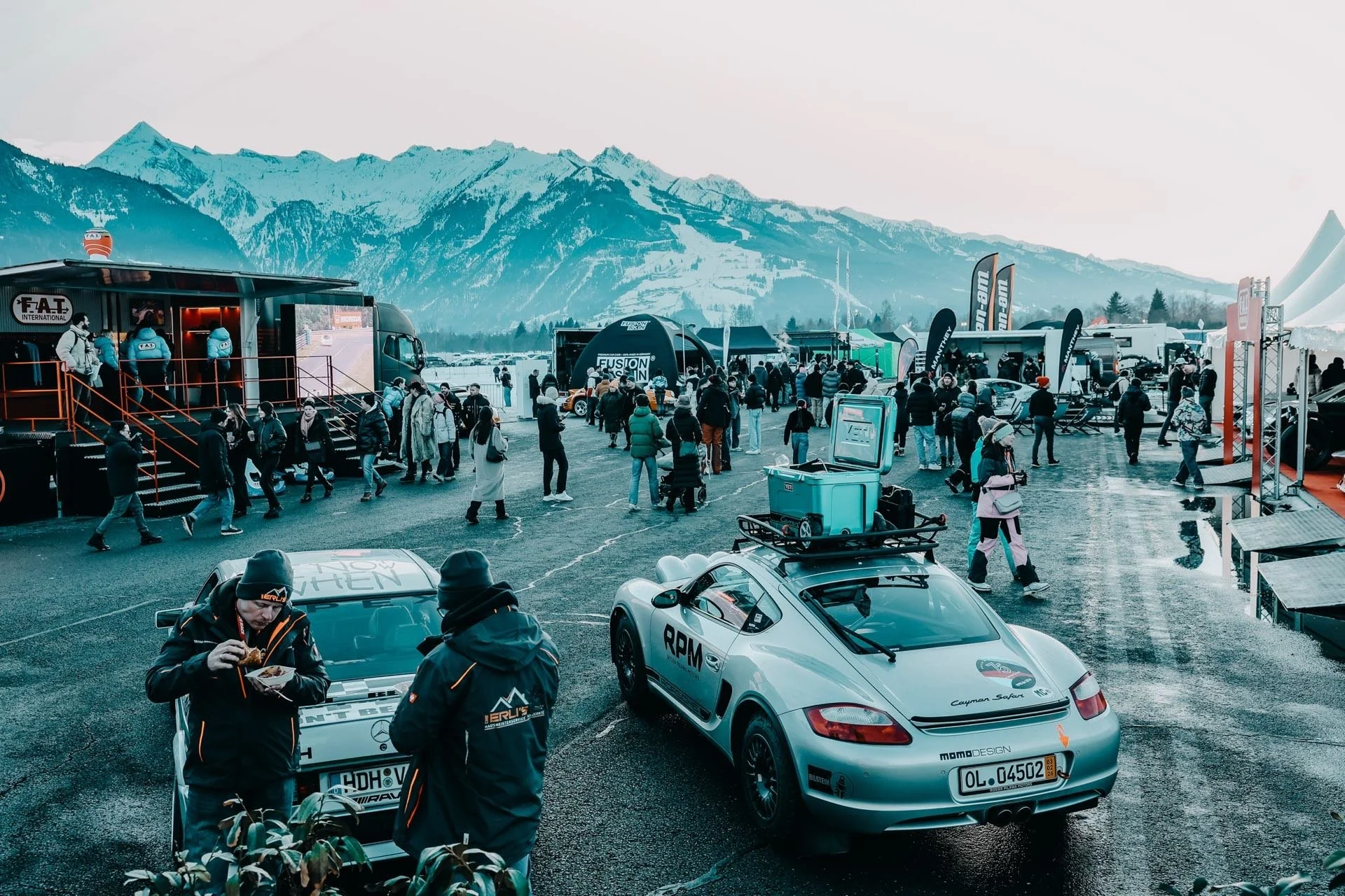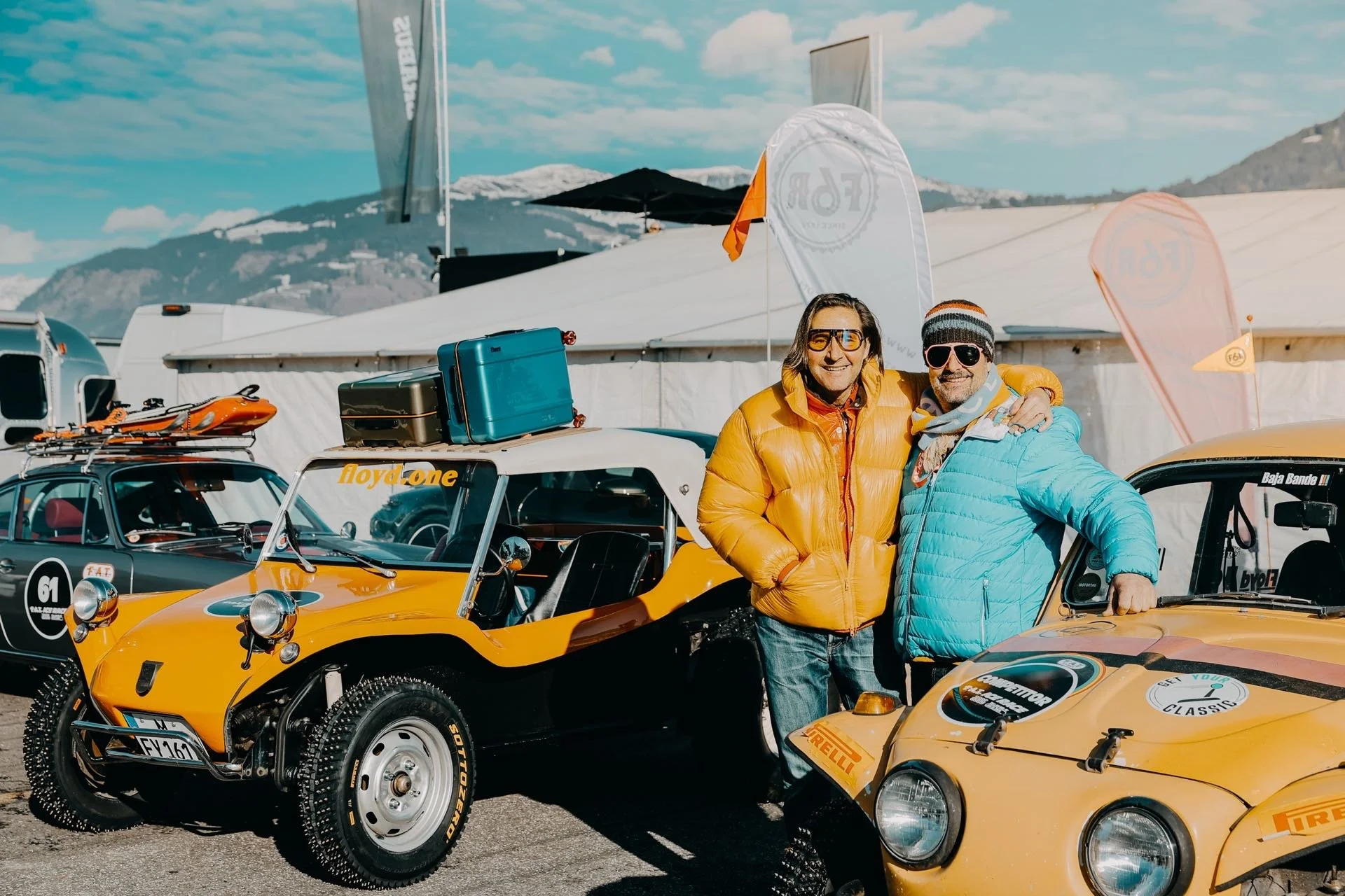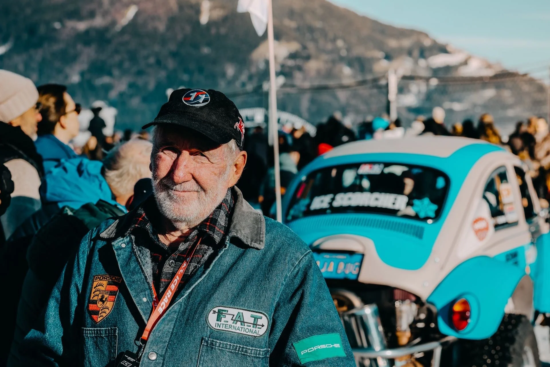 Von den schneebedeckten Alpen hallen Fehlzündungen wider. Schnee spritzt bis in die Zuschauerreihen. Ein orangefarbener Porsche 356 mit roten Felgen driftet vorbei, dahinter ein Skifahrer mit wehendem rotem Cape. Das Publikum jubelt, fette Beats wummern aus dem Boxenturm. Der nächste Starter: ein VW Käfer „Baja Bug“ mit Skifahrer im bunten 80er-Jahre-Skioverall.