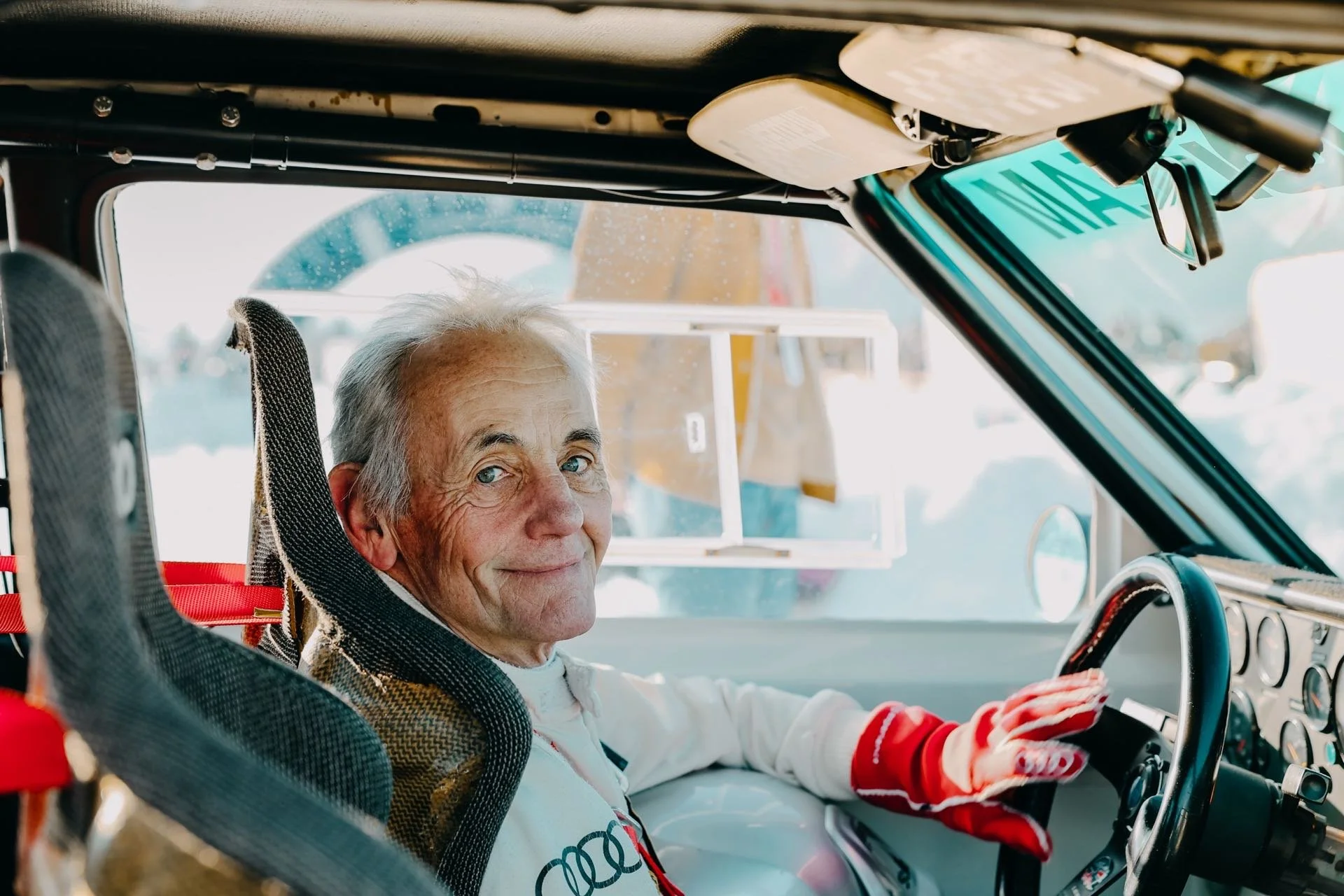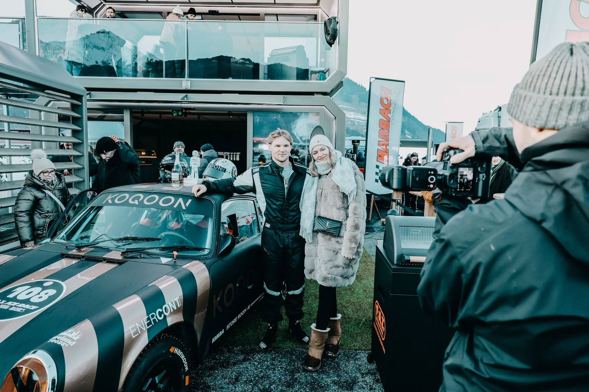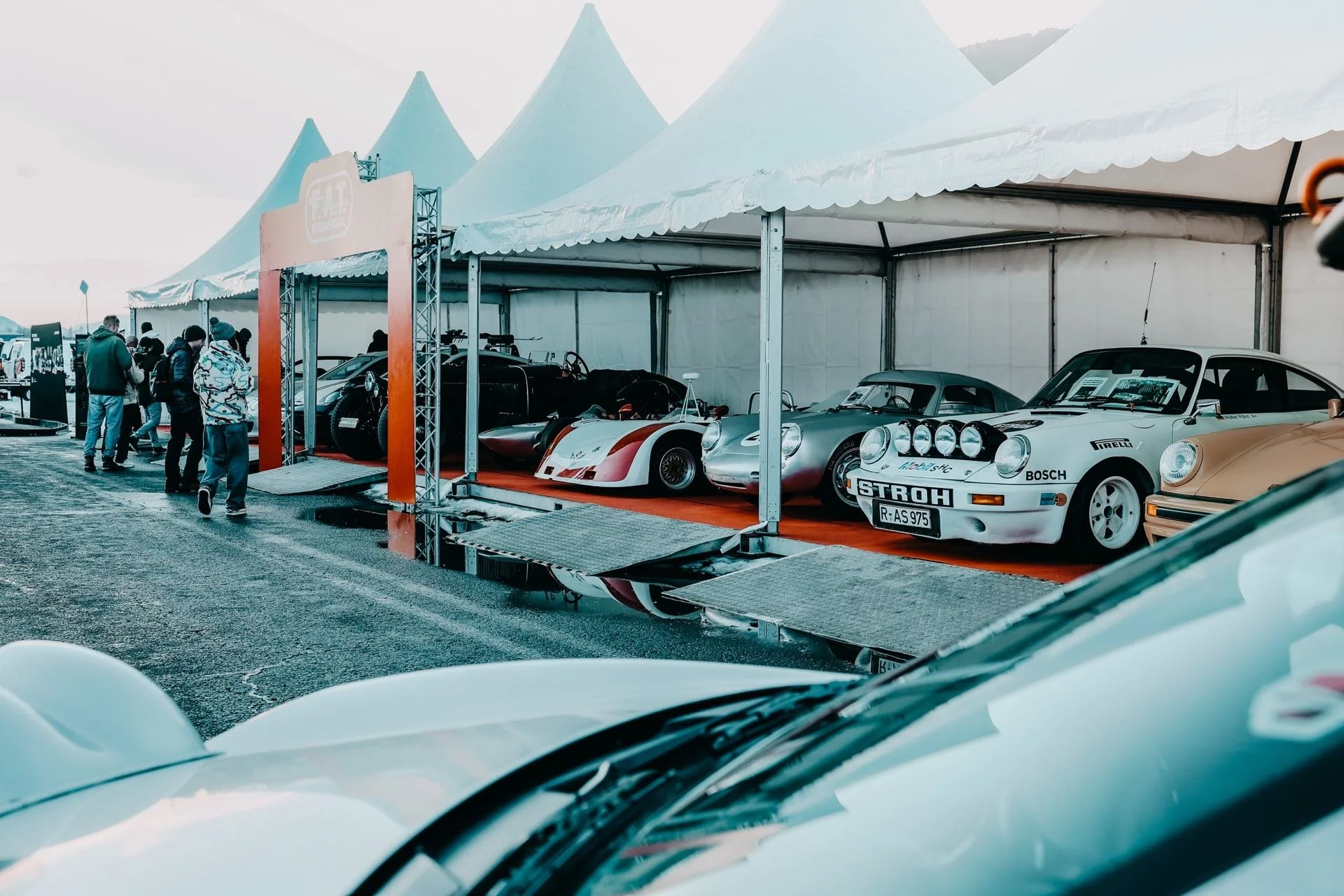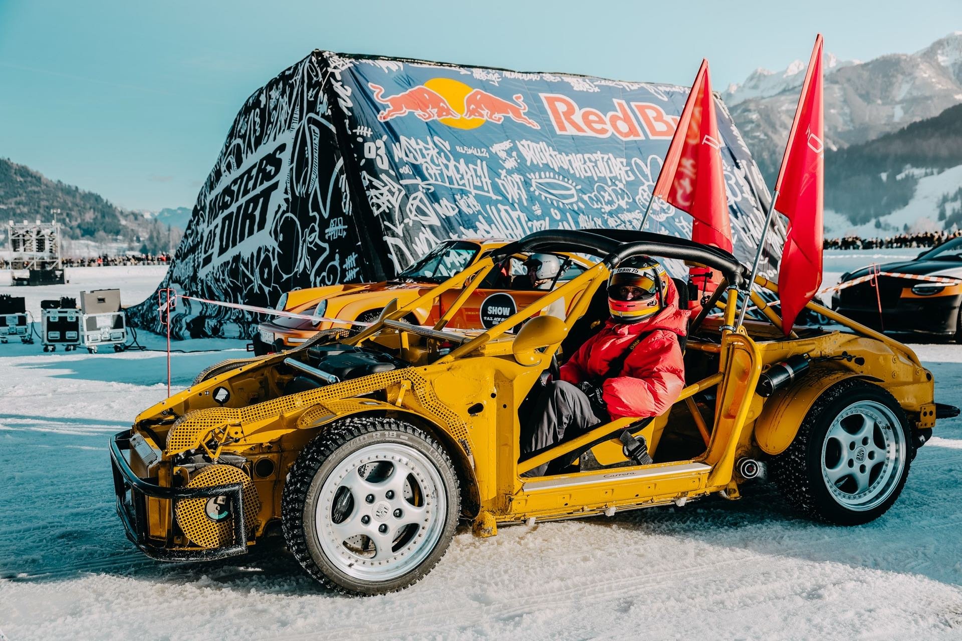 Von den schneebedeckten Alpen hallen Fehlzündungen wider. Schnee spritzt bis in die Zuschauerreihen. Ein orangefarbener Porsche 356 mit roten Felgen driftet vorbei, dahinter ein Skifahrer mit wehendem rotem Cape. Das Publikum jubelt, fette Beats wummern aus dem Boxenturm. Der nächste Starter: ein VW Käfer „Baja Bug“ mit Skifahrer im bunten 80er-Jahre-Skioverall.