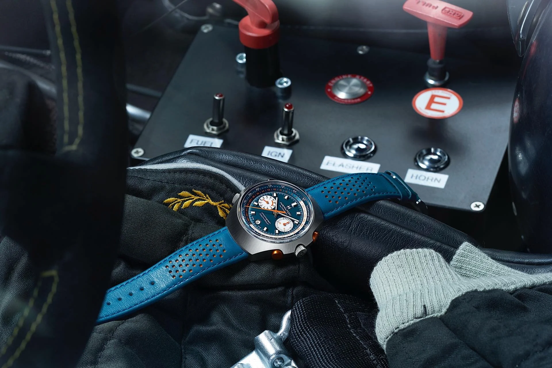 Die Hamilton Chrono-Matic 50 Limited Edition im Cockpit eines Youngtimer-Rennwagens.