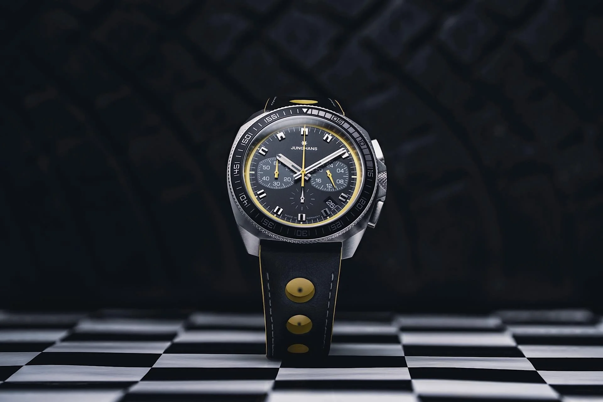 Die Junghans 1972 Chronoscope OGP Edition 2025 mit racing-gelben Akzenten.