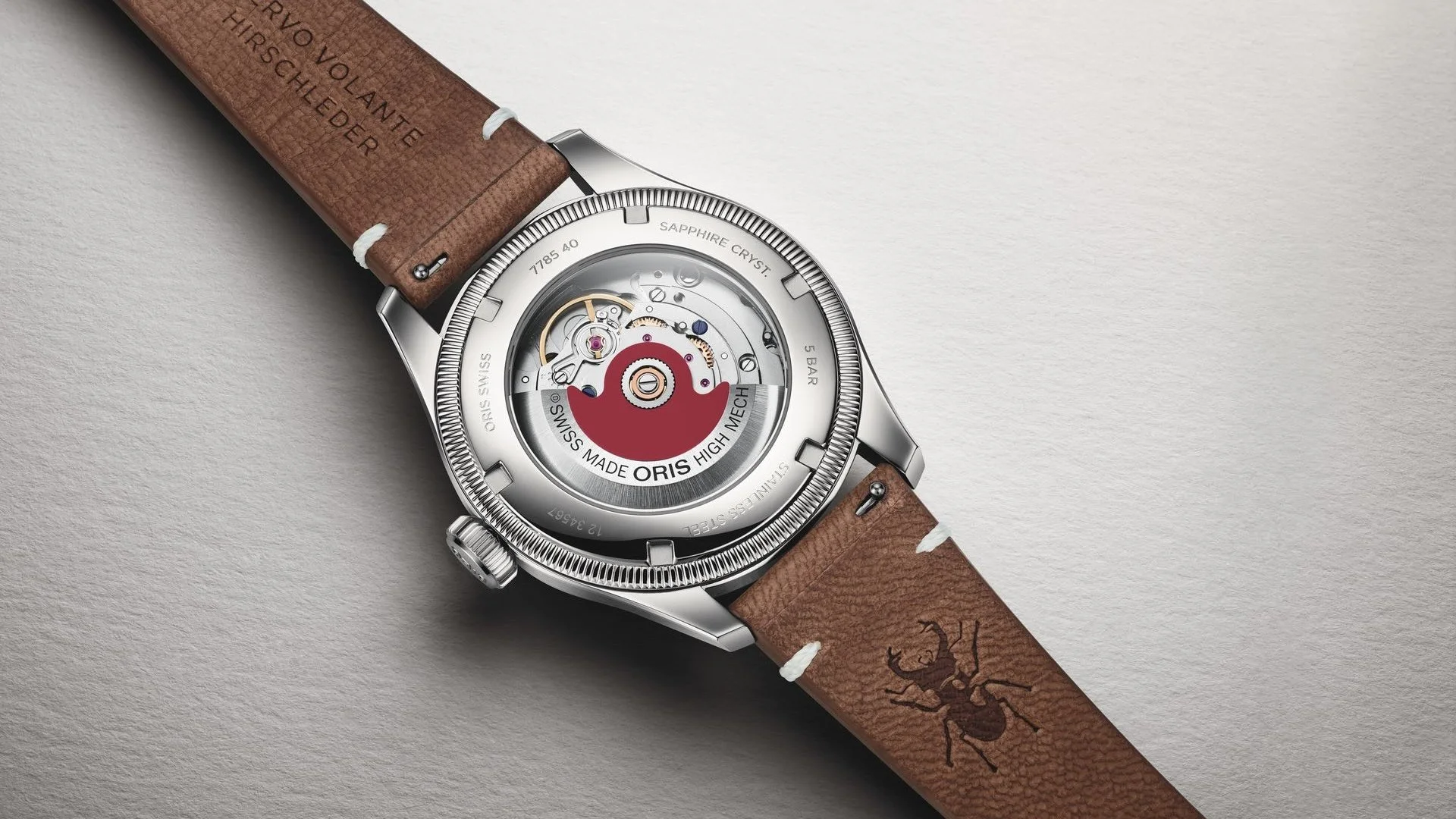 Das Werk der Neuheit zeigt den typischen roten Oris-Rotor und das Band den Hirschkäfer von Cervo Volante.