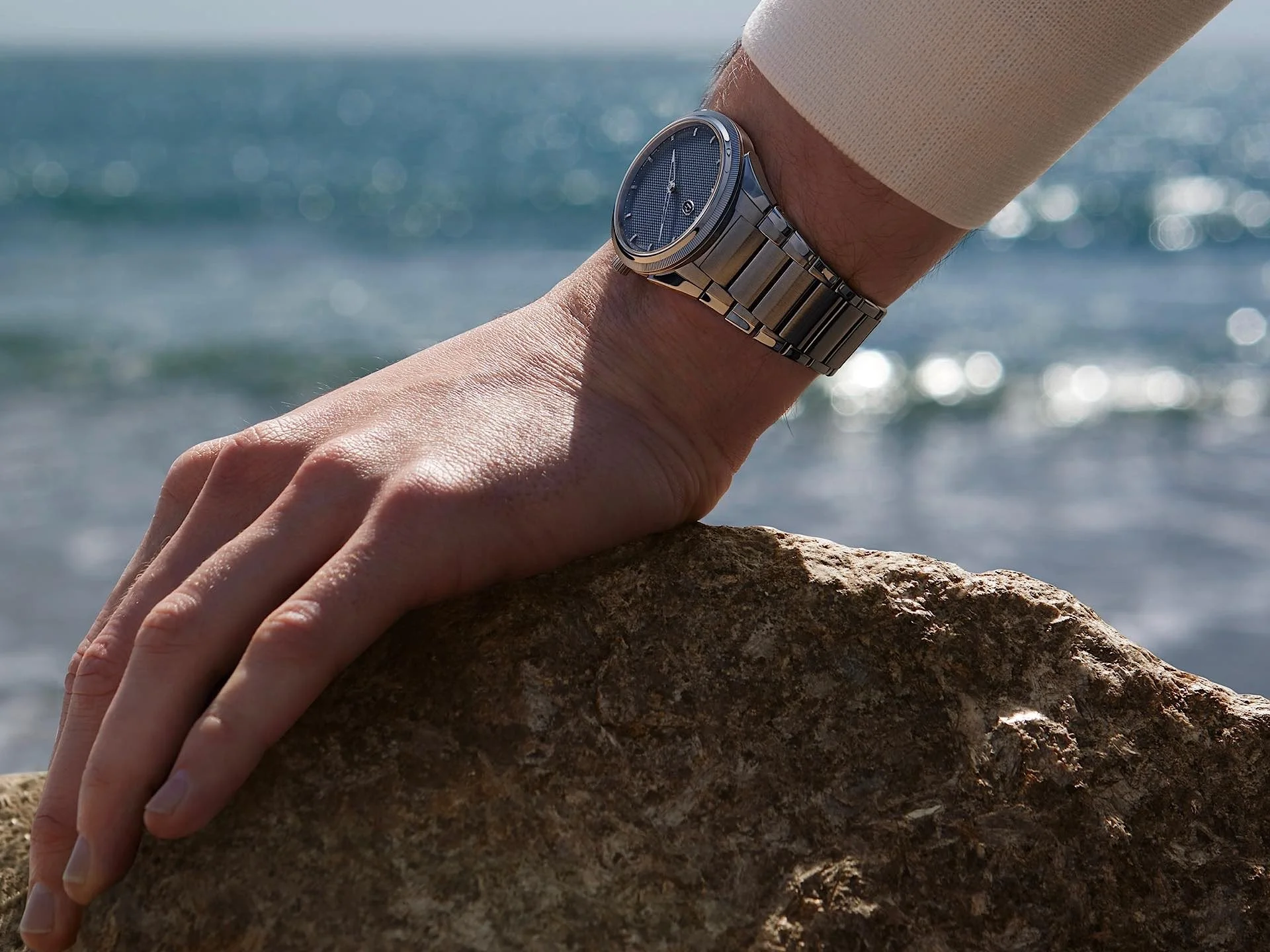 Die raffinierten Details setzen sich am Gehäuse fort: Die gerändelte Platinlünette fasst das Zifferblatt ein, am Edelstahlgehäuse und Armband wechseln sich polierte und satinierte Flächen ab, und die von der Seite gesehen wie Flügel geformten Bandanstöße verjüngen sich, was einen harmonischen Übergang zum Armband ermöglicht.