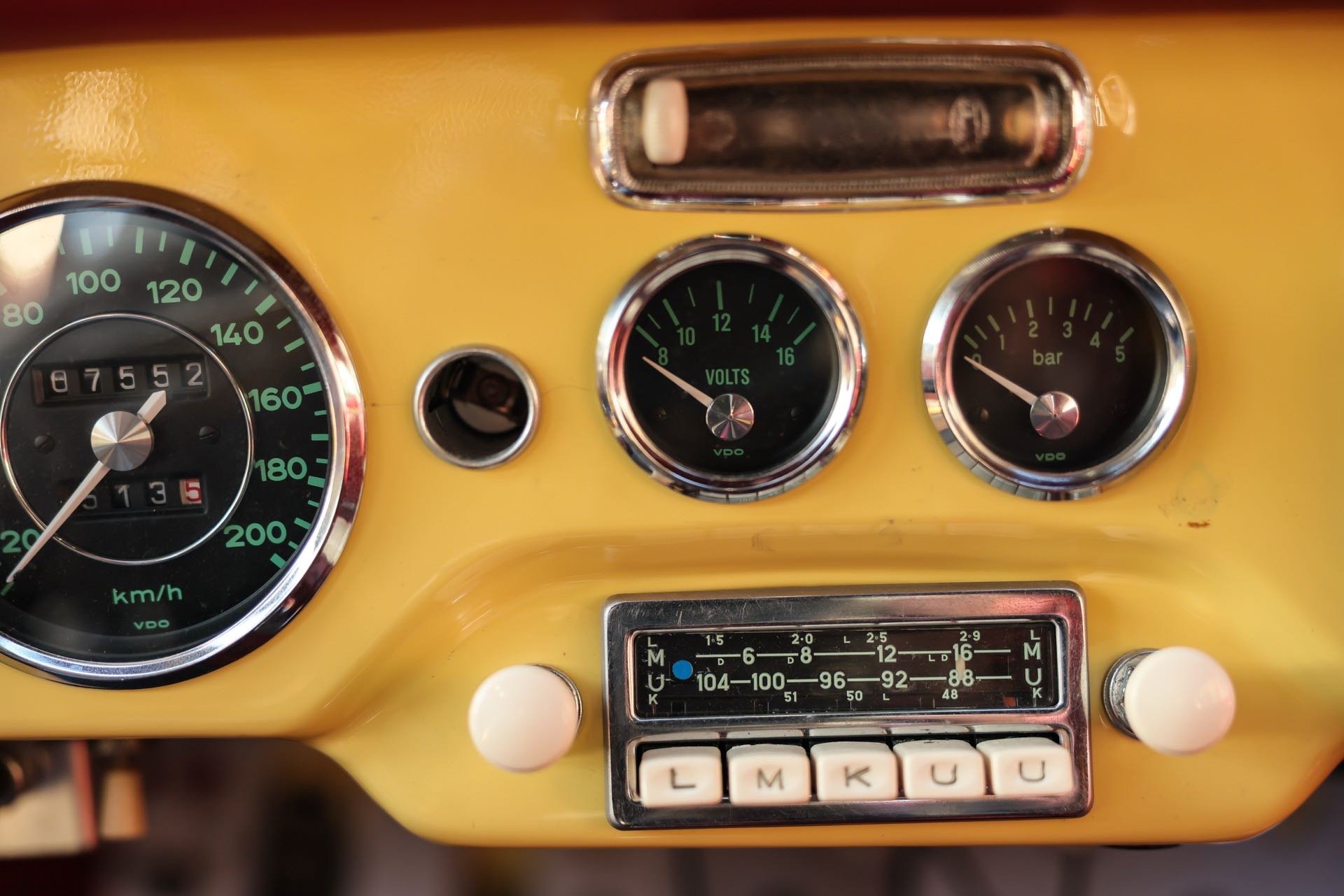 Das Armaturenbrett zeigt VDO-Instrumente mit grüner Beleuchtung: Tachometer bis 200 km/h, Voltmeter und Öldruck-Anzeige. Daneben ein zeitgenössisches Radio mit Drucktasten für Lang-, Mittel- und Kurzwelle. Ein Highlight sitzt vor dem Beifahrer: eine Heuer Trackmate Stoppuhr mit Porsche-Wappen, montiert auf einer gelochten Aluminiumplatte. Ein Detail, das Rallyeherzen höher schlagen lässt. Zusätzlich gibt es eine klassische Zeituhr.