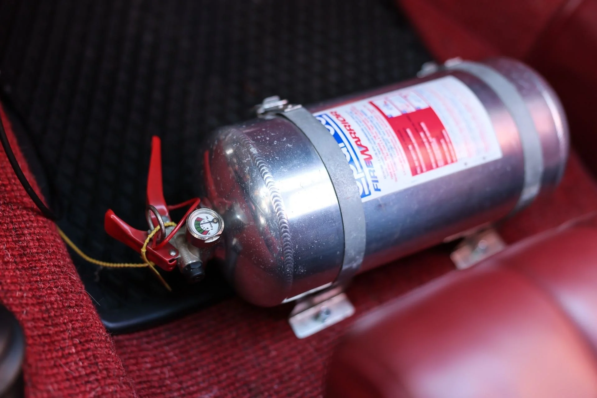 Das rote Lederinterieur mit Sportsitzen und Kopfstützen ist keine Serienausstattung, sondern eine bewusste Farbkombination, die den Charakter des Fahrzeugs unterstreicht. Das Holzlenkrad mit Porsche-Wappen passt zur sportlich-eleganten Ausrichtung. Im Beifahrerfußraum ist ein Feuerlöscher griffbereit montiert.