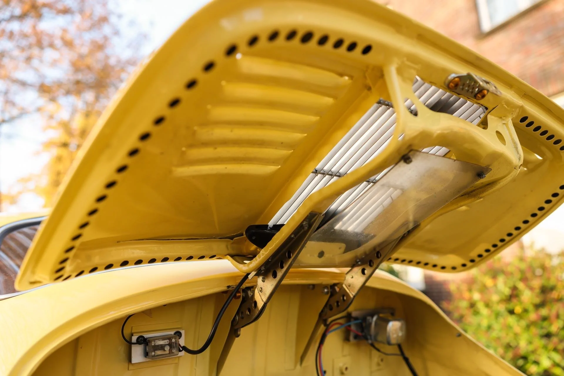 Die technischen Modifikationen gehen tief. Zwei Solex-Doppelvergaser vom Typ 40 P II mit offenen Sportluftfiltern und eine Sebring-Auspuffanlage im 4-in-1-Design haben die Leistung gegenüber dem 1,6 Liter großen 60 PS starken 4-Zylinder-Boxer-Serienmotor gesteigert. Der charakteristische Sound dieses Auspuffs ist bei historischen Rennen unverkennbar: rau, direkt und laut genug, um Aufmerksamkeit zu erregen.