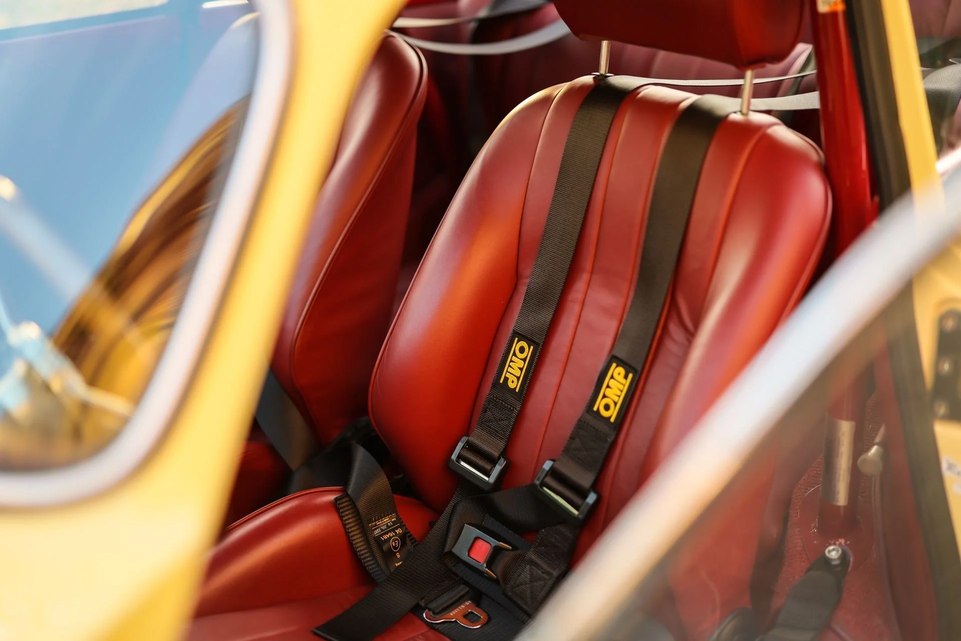 Schön und sicher: Neues rotes Leder, Kopfstützen und Vierpunktgurte.