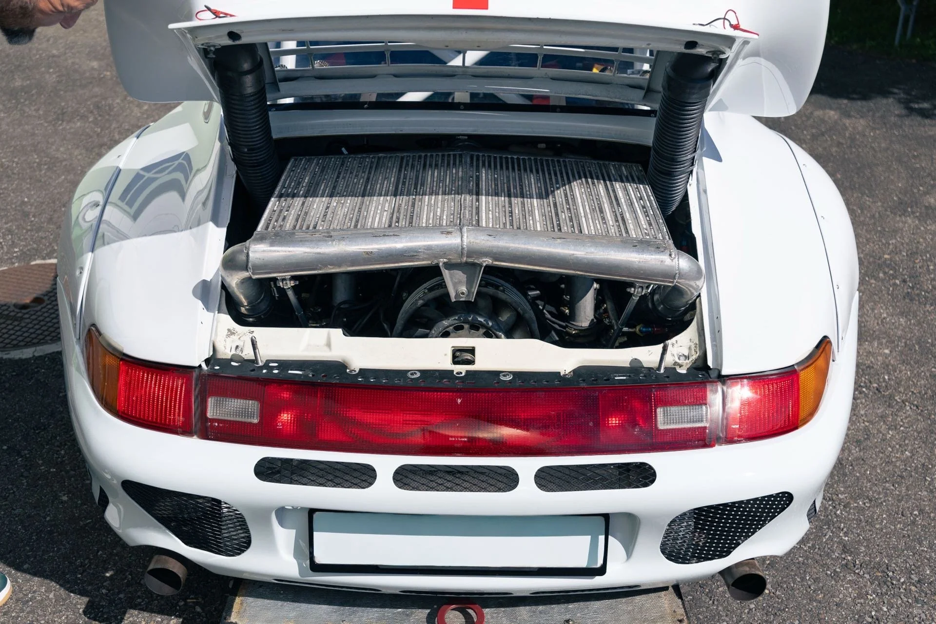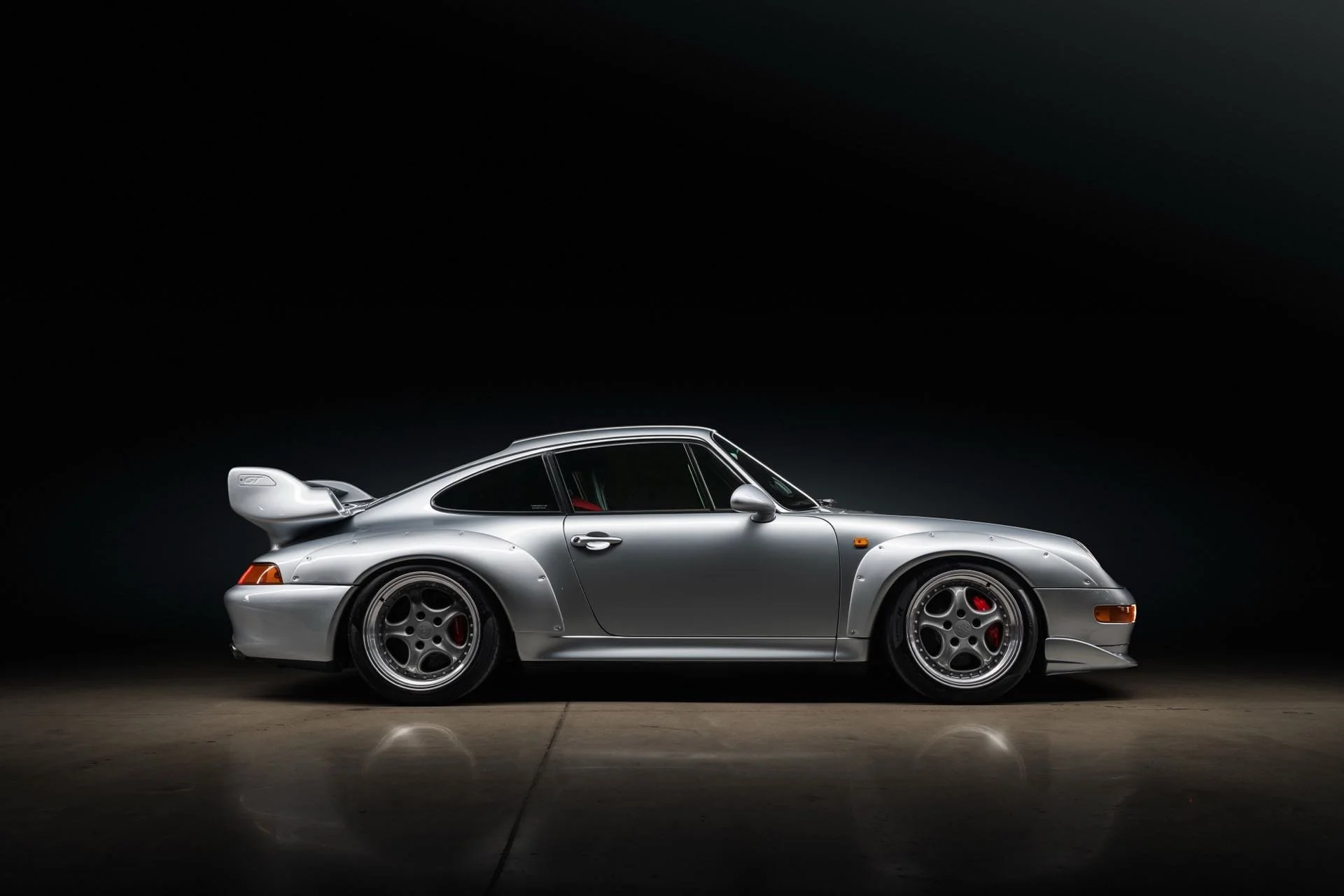 Der 993 GT2 ist leicht an den geschraubten Kotflügelverbreiterungen, der Frontspoilerlippe und dem Heckflügel mit Lufteinlässen zu erkennen. Von der ersten Version wurden bis 1997 nur 172 Exemplare gebaut.