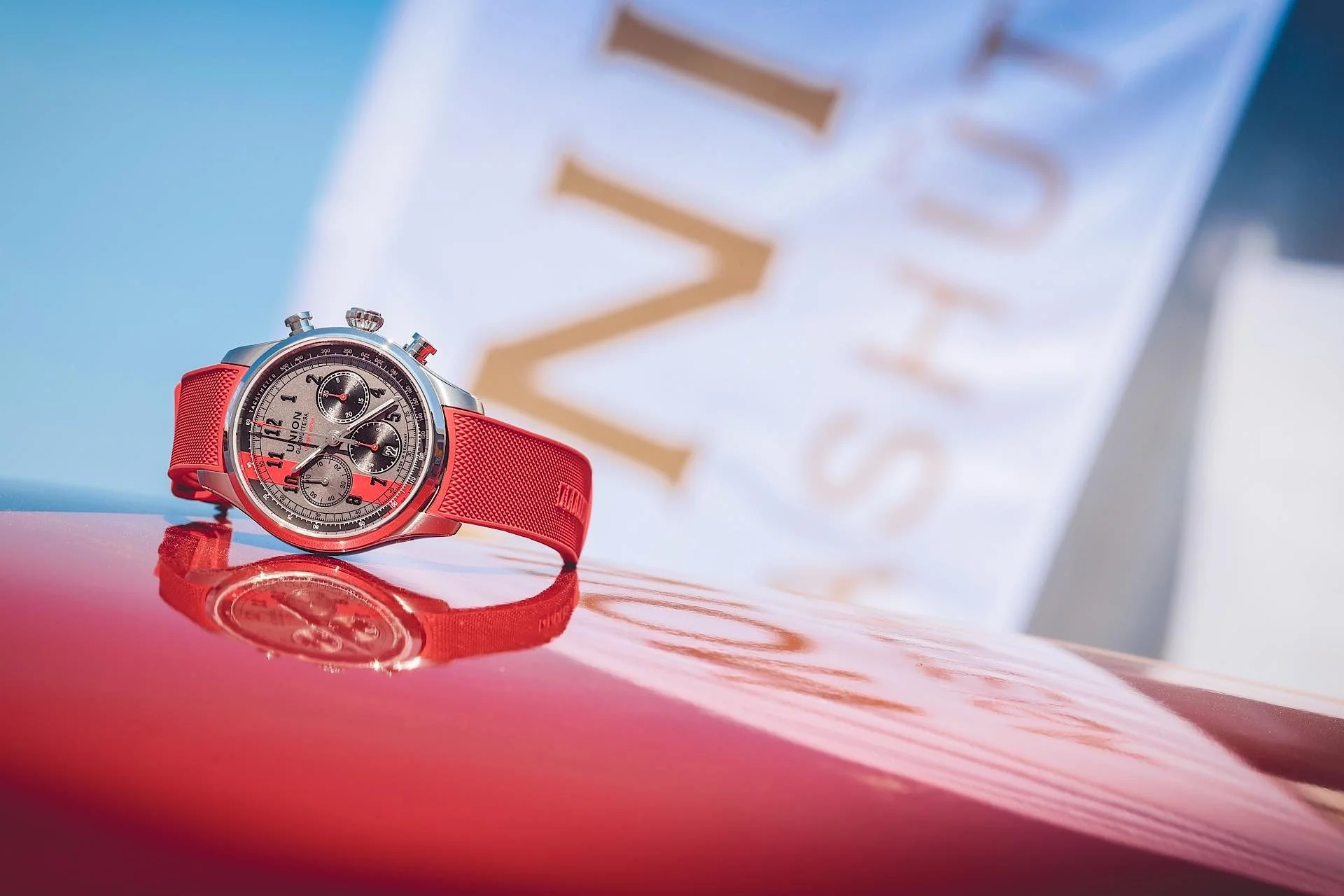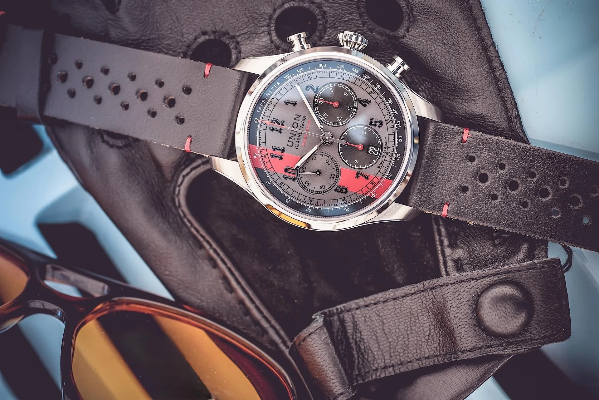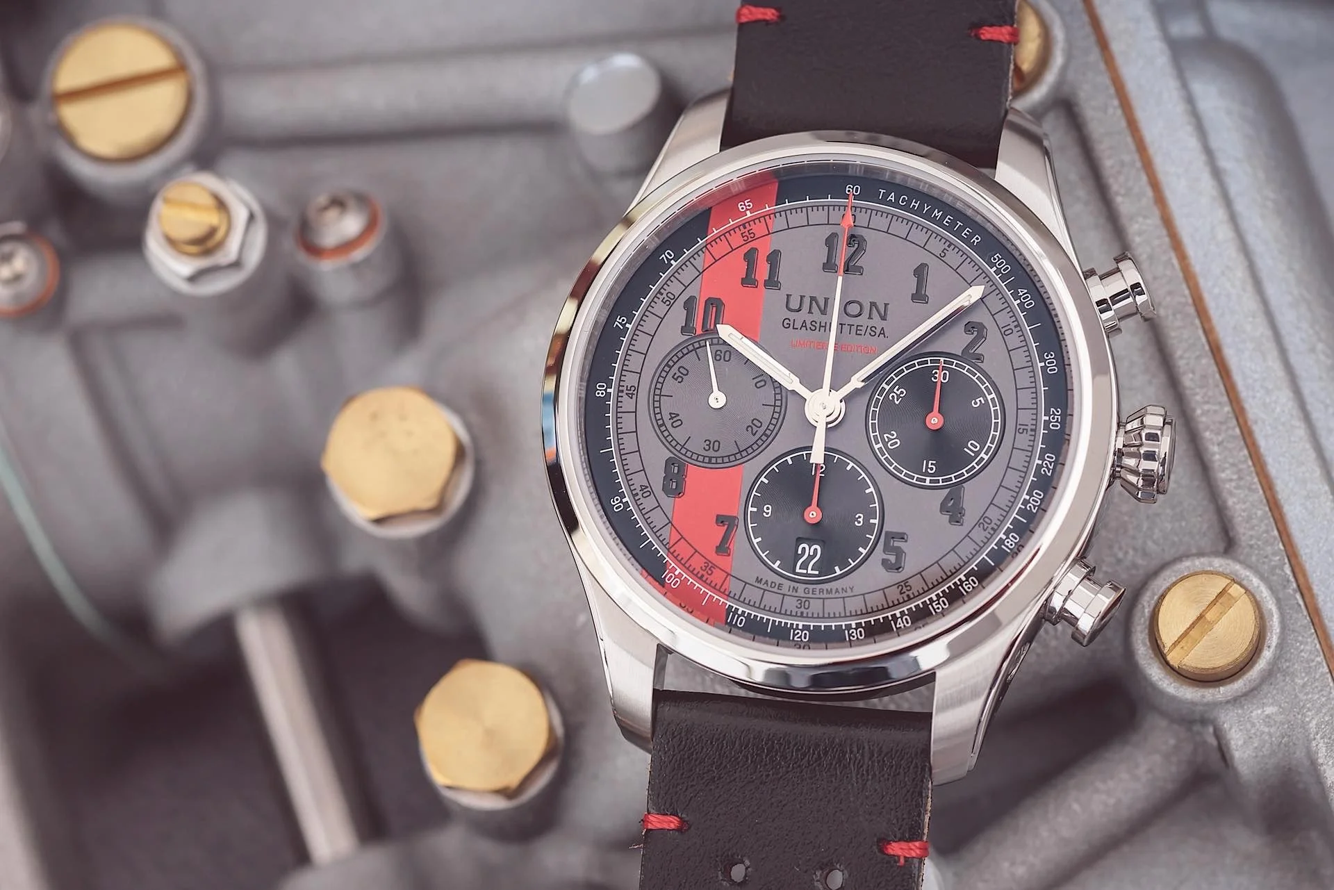 Zum sportlichen roten Streifen auf dem Zifferblatt passen die roten Chronographenzeiger und der rote Schriftzug „Limitierte Edition“. Union Glashütte ist eine deutsche Marke – das merkt man. Genauer gesagt kommt sie aus dem Uhrenmekka Glashütte in Sachsen, das nach der Wiedervereinigung erneut zum Zentrum der Uhrmacherkunst, zur Heimat der feinsten Manufakturen und zum Gütesiegel mechanischer Uhren wurde.