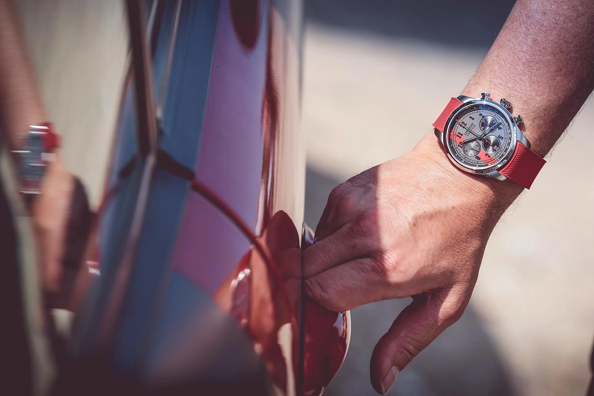 Der Porsche 993 mit dem roten Querstreifen war die Inspiration für das Zifferblatt des Belisar Chronograph Speedster.
