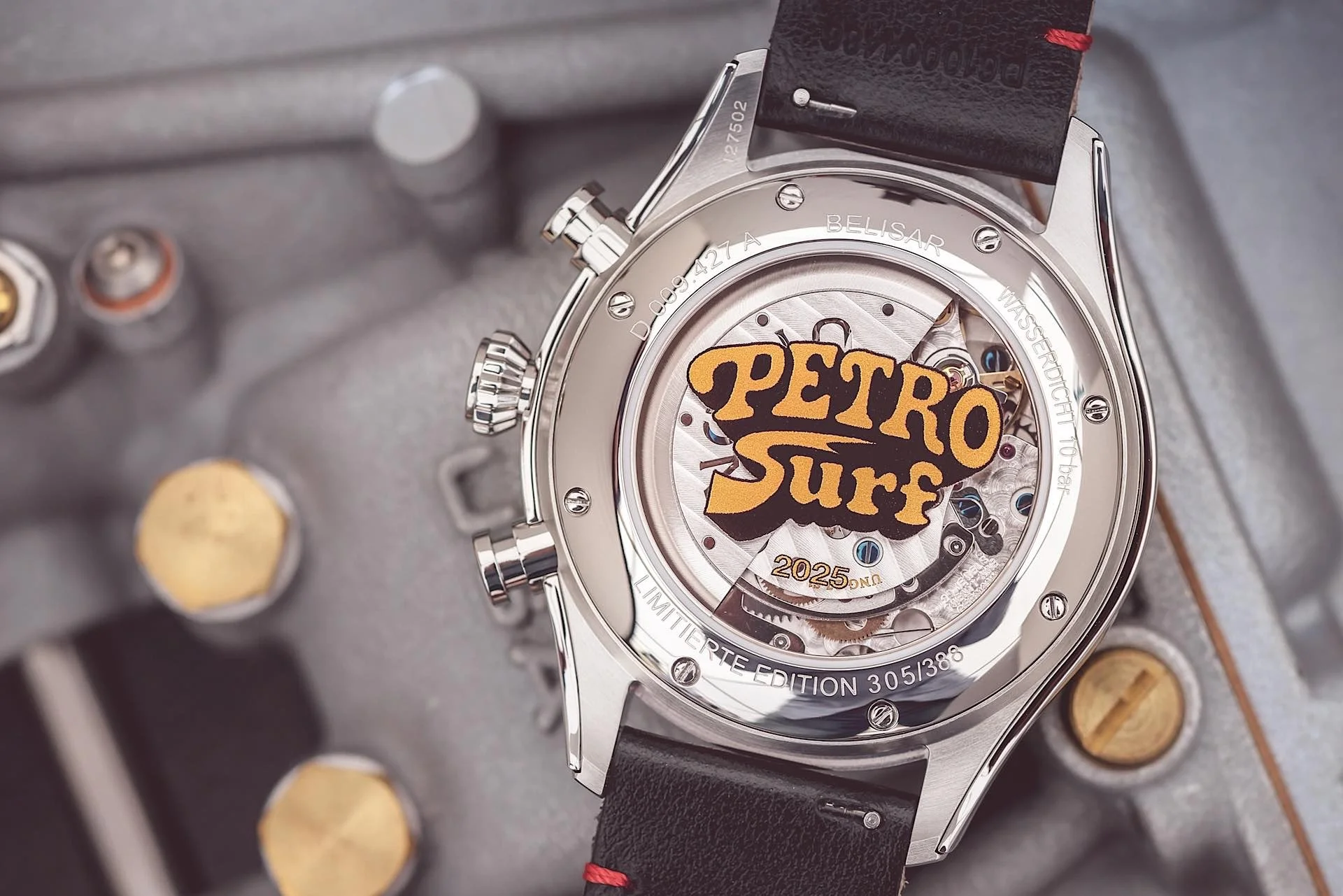 Passend zur siebten Ausgabe des Petro-Surf Festivals baut Union Glashütte nur sieben Stück der Sonderedition. Die exklusive Uhr basiert auf dem Belisar Chronograph Speedster, der auf 388 Exemplare limitiert ist. Während das Zifferblatt gleich ist, zeigen die sieben Festival-Uhren mit den Nummern 301 bis 307 das farbige Petro-Surf-Logo auf dem Glasboden. Es wurde so eingelasert, dass die Farben genau wiedergegeben werden. Das war Union Glashütte und Ken Hake, dem Petro-Surf-Gründer, extrem wichtig.